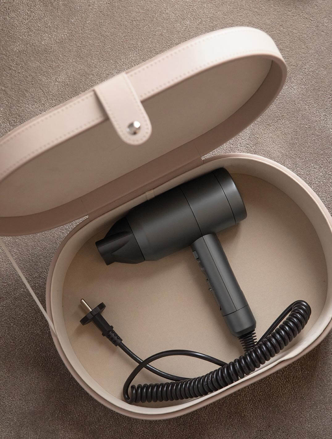 The Nevis Box in Natural offers a luxurious and practical storage solution. Crafted with a natural-coloured fabric and fine stitching, this box is specially designed to store Bentley hair dryers safely and neatly. Its luxurious design is matched by its functionality, being water-repellent and easy to clean, making it an essential accessory for any luxury hotel room.
